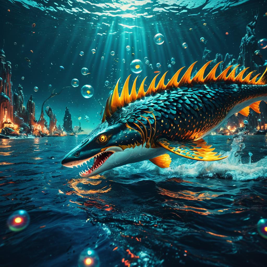 Colossal dragon swimming in ocean waters like a shark, vibrant colors, little bubble cities under water with bright lights, 4K image, surreal fantasy art by John Harris