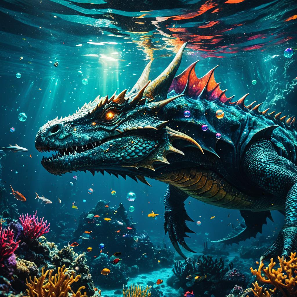 A surreal fantasy illustration of a colossal dragon swimming underwater like a shark. The dragon has vibrant blue and orange scales with glowing eyes and prominent horns. The underwater scene is filled with colorful coral reefs, small vibrant fish, and bright bubbles resembling miniature bubble cities illuminated by soft light beams in deep ocean waters.