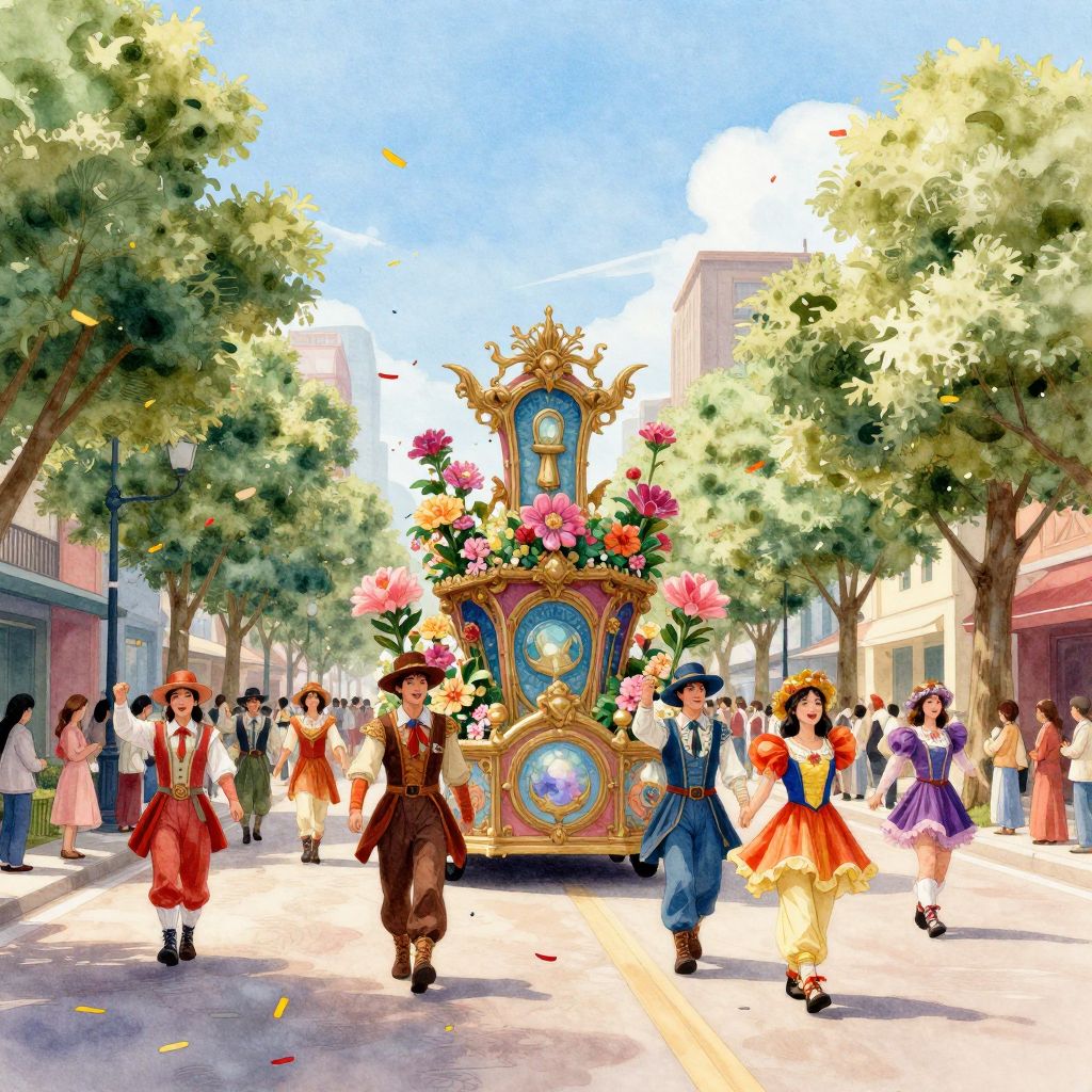 A vibrant, digital illustration depicts a festive parade in a sunlit, tree-lined street. A ornate, flower-adorned float with golden accents and a blue, circular emblem is centered. Dressed in colorful, traditional attire, participants in the foreground wear hats and long coats in shades of brown, red, and blue. Onlookers, including men in suits and women in dresses, line the street. The background features buildings with pink and beige facades. The sky is clear with a few fluffy clouds, enhancing the lively, cheerful atmosphere. The illustration style is bright and whimsical, with bold colors and detailed textures.