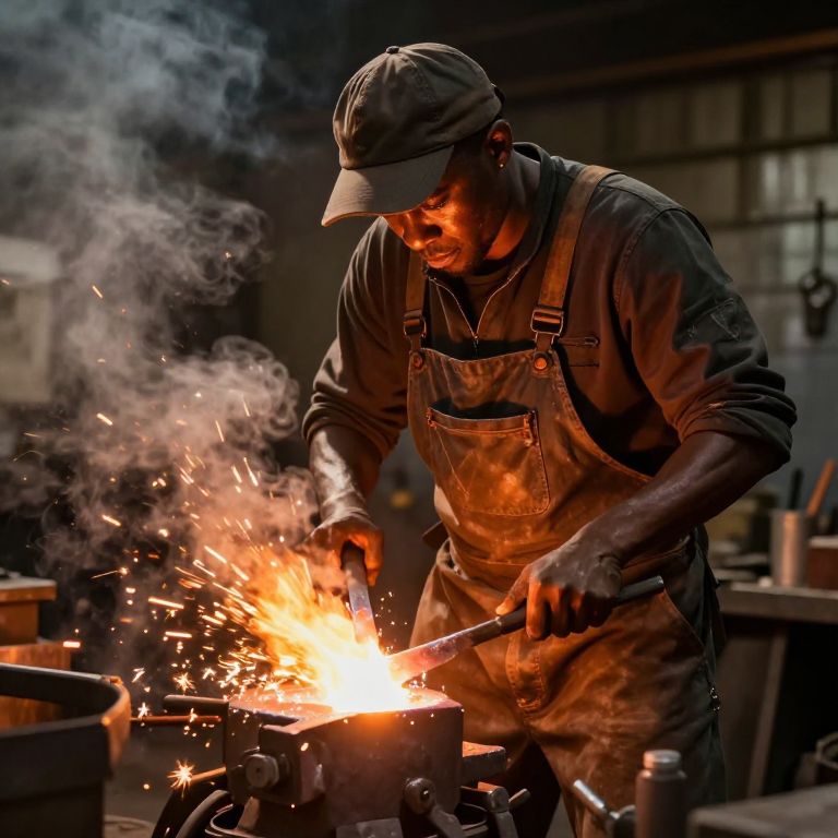 In a cyberpunk-inspired digital art rendering, a blacksmith clad in rugged overalls and a cap skillfully forges molten metal under dramatic golden-hour lighting, capturing the essence of craftsmanship amidst a smoky, industrial backdrop where sparks and flames dance like intangible proof of his artistry.