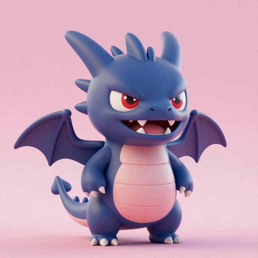 A 3D rendered illustration of a cute, small, dark blue dragon monster with large red eyes, sharp white teeth, and a pink belly. The character has spikes on its head and back, small wings, and a playful, mischievous expression. The background is a solid pink gradient.