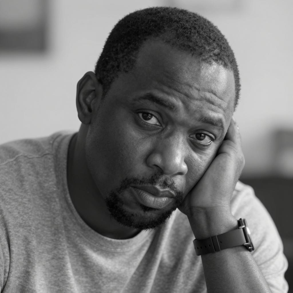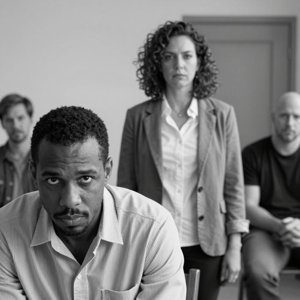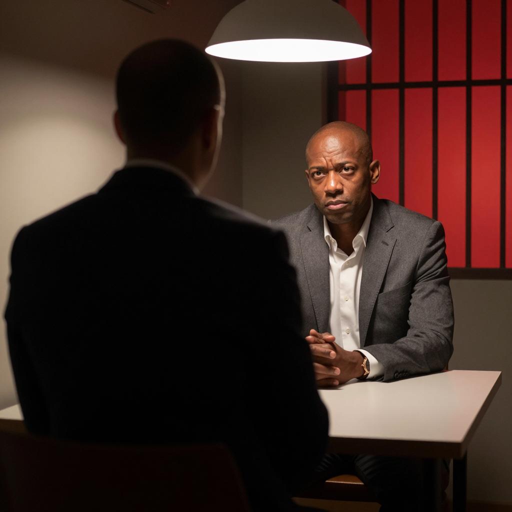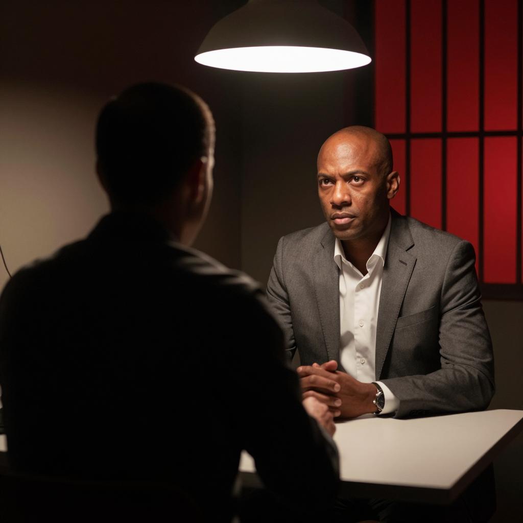 Two men in a dimly lit room. The man in the foreground is backlit, dark silhouette. The man in the background is bald, medium brown skin, wearing a gray suit, white shirt, intense expression. Hanging light above, red light through barred window on the right. Table between them.