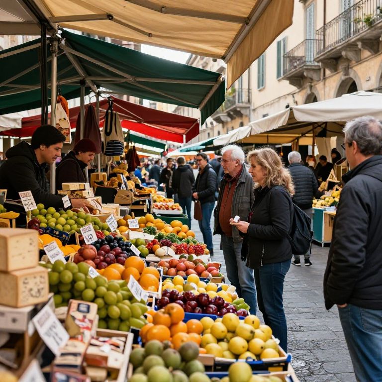 A lively Torino market scene, vibrant stalls filled with fresh fruits, cheeses, and local delicacies, people interacting warmly, colorful awnings, historic buildings in the background, sunlit ambiance, rich detail, energetic and authentic vibe.