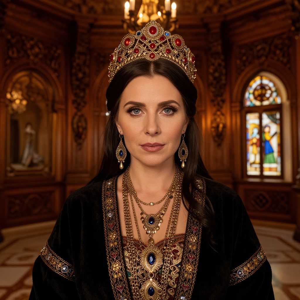 Portrait of Vladimirovna, a regal woman with piercing eyes and ornate jewelry inspired by Slavic culture, set in a grand old palace with detailed wood carvings and stained glass windows, ambient warm lighting highlighting her dignified presence.