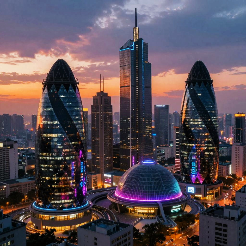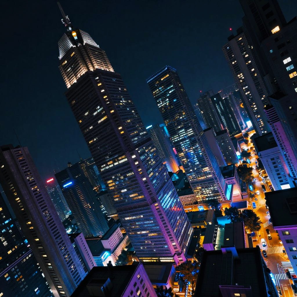 A futuristic cityscape viewed at a dramatic 45 degree tilt, skyscrapers leaning diagonally, neon lights glowing vividly in a cyberpunk style night scene, highly detailed