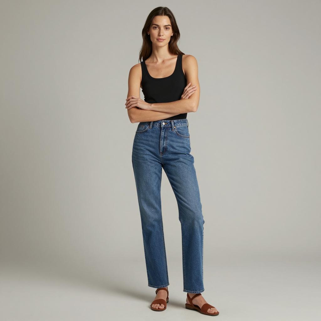 Palazzo pants outfit costume, photograph of a young woman standing outdoors, daylight, gray background, wearing a beige tank top, high-waisted orange wide-leg pants, black sandals, hands in pants pockets, straight brown hair, neutral expression, simple setting, minimal shadows, casual summer style, realistic ure, full body shot
