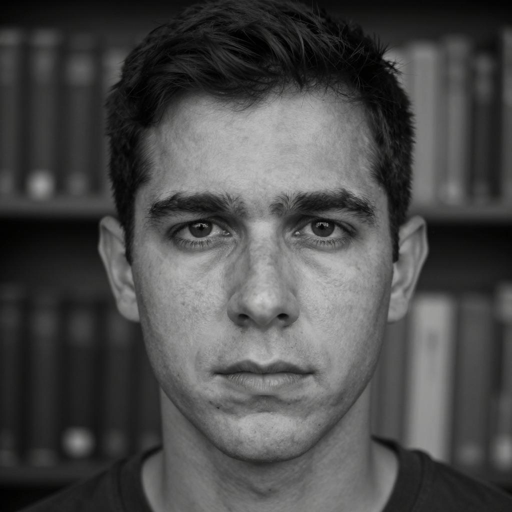 Dark photograph of a young man with short, dark hair and intense gaze, wearing a blue shirt, against a dark background. Light from front left highlights his face and upper body. Neutral expression. Centered in frame.