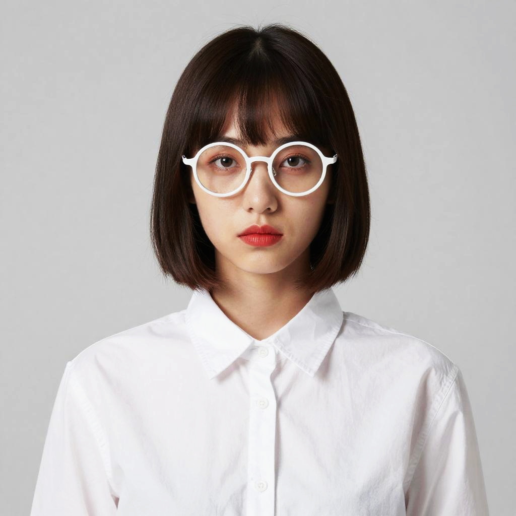 Photograph of a young woman with fair skin, short dark brown bob haircut with blunt bangs, and wearing round, white-framed glasses. She has red lipstick and is dressed in a white collared shirt with a subtle texture. Her expression is neutral, and she stands against a plain, light gray background. The overall style is modern and minimalist.