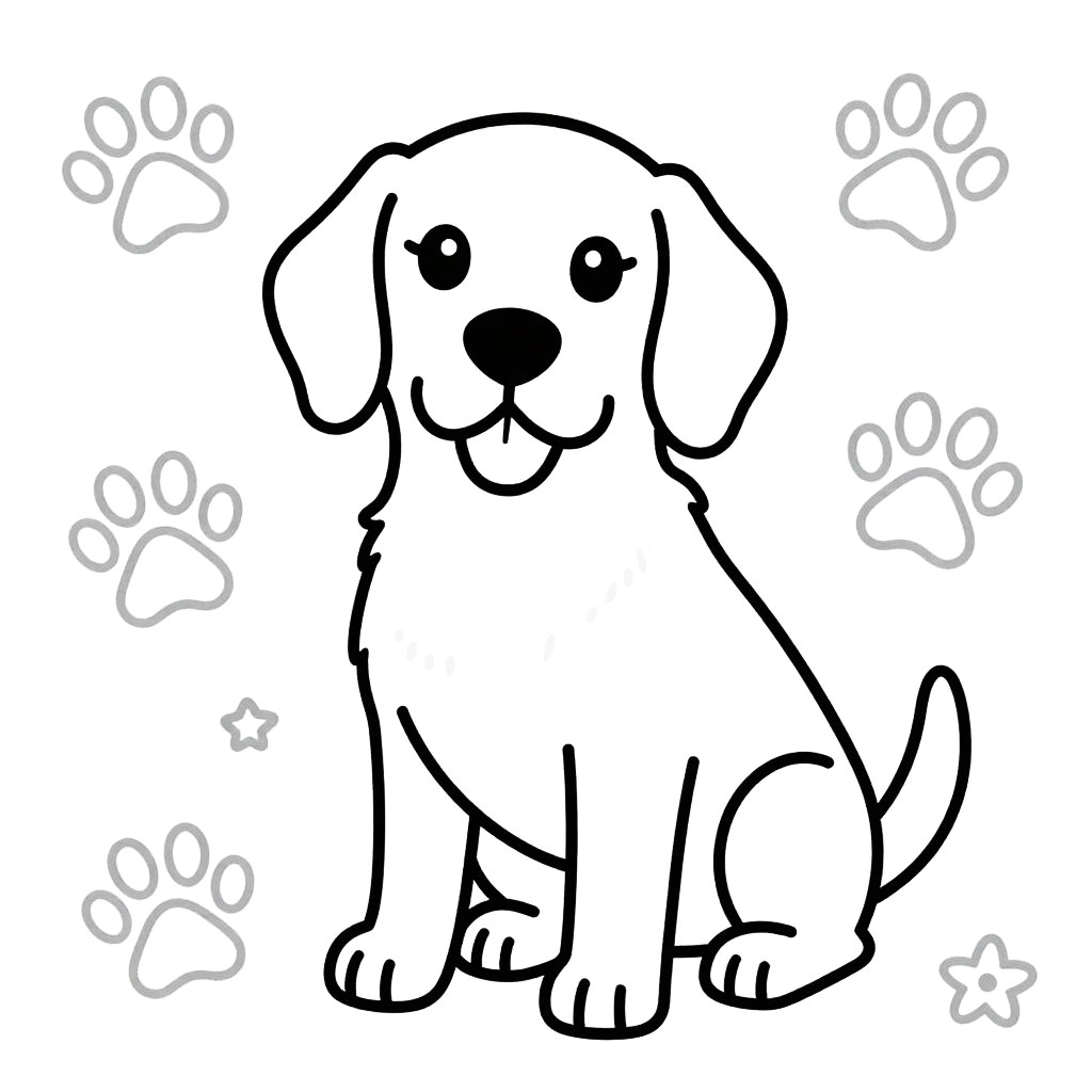 Black and white line drawing of a cute, smiling Labrador puppy with large eyes, sitting, surrounded by paw prints.