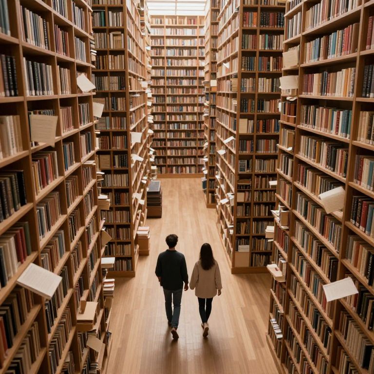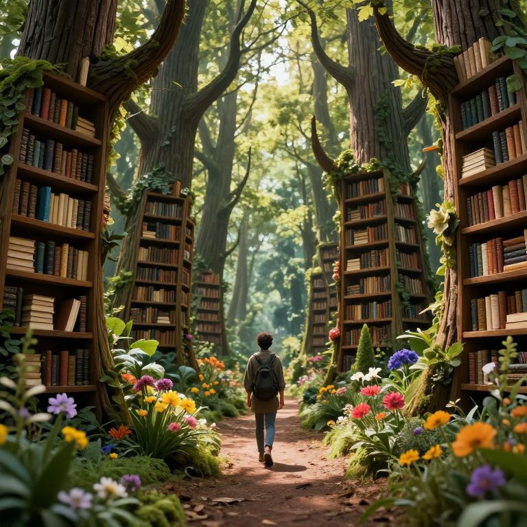 In a surreal, high-definition digital rendering, two figures walk through a fantastical library where towering shelves of ancient books merge seamlessly with lush greenery, creating an enchanting pathway that whispers stories to those who listen, blending the realms of reality and imagination in a cyberpunk-inspired vision.