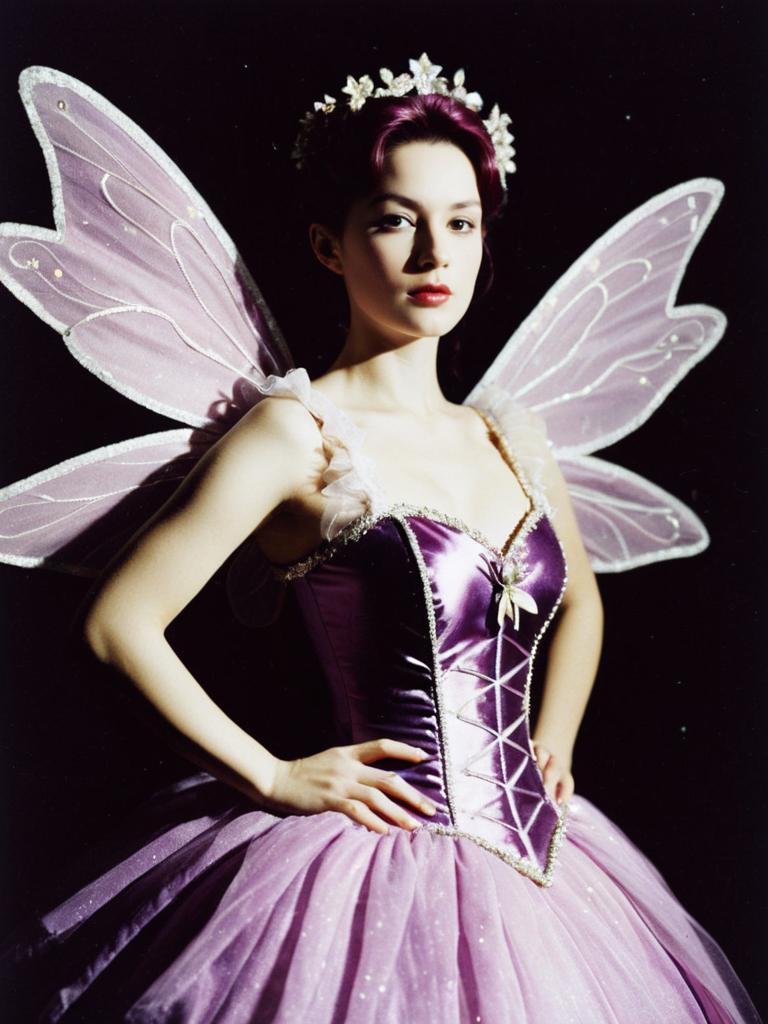 Photorealistic waist-up portrait of a woman dressed as the Sugar Plum Fairy. She wears a purple costume with intricate silver detailing, a sparkling star-shaped tiara, and large decorative fairy wings. The background is dark, emphasizing the vibrant costume and her serene expression.