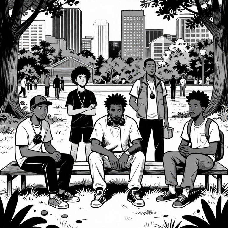 The boondocks pictures, stylized black and white comic art featuring sharp contrasts, reflective characters in a city park setting, emphasizing social issues and personal emotions with intricate linework