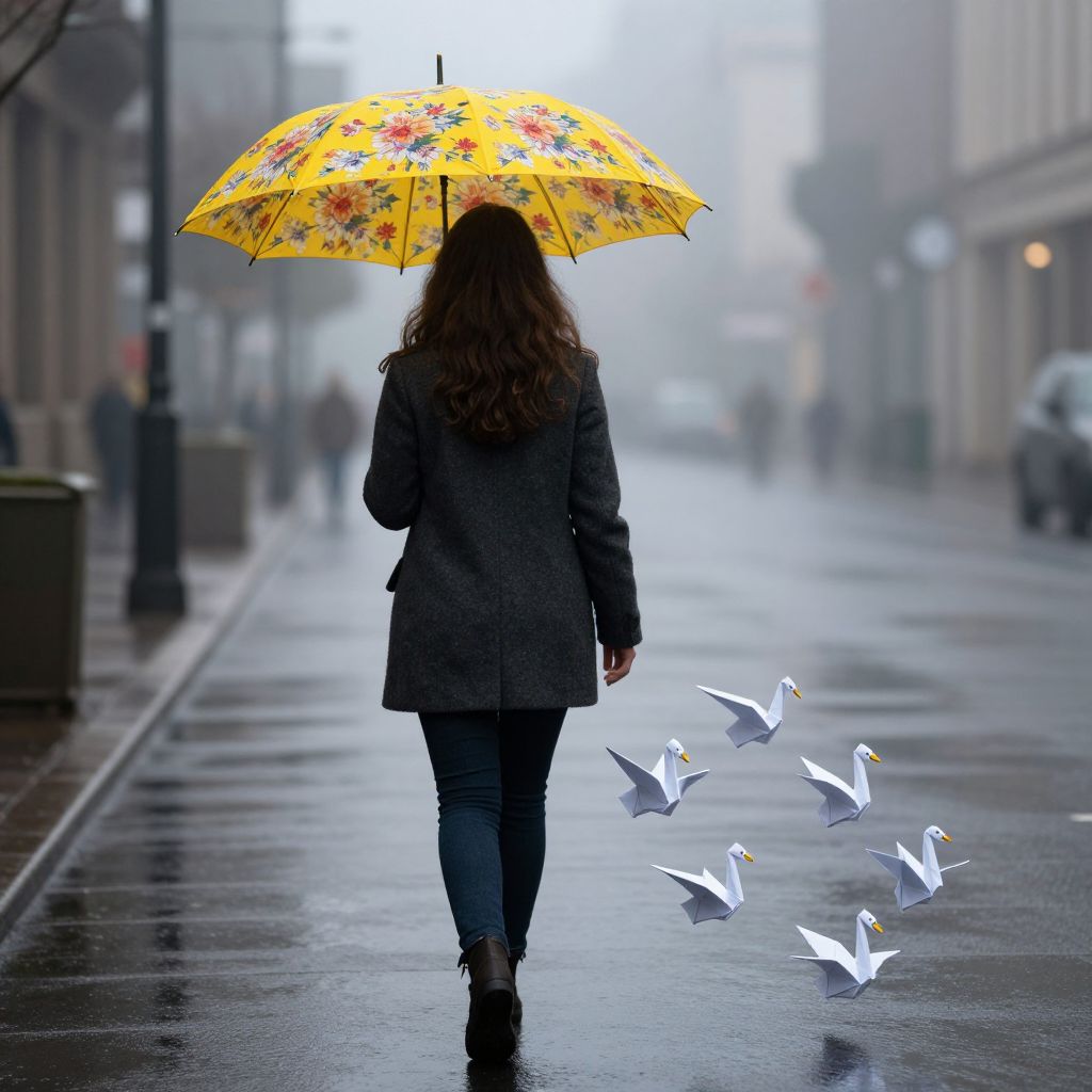 A woman walks through a misty city street, her back turned as she holds a vibrant yellow floral umbrella above her head, while six origami swans trail behind her, their delicate forms gliding gracefully along the wet pavement.
