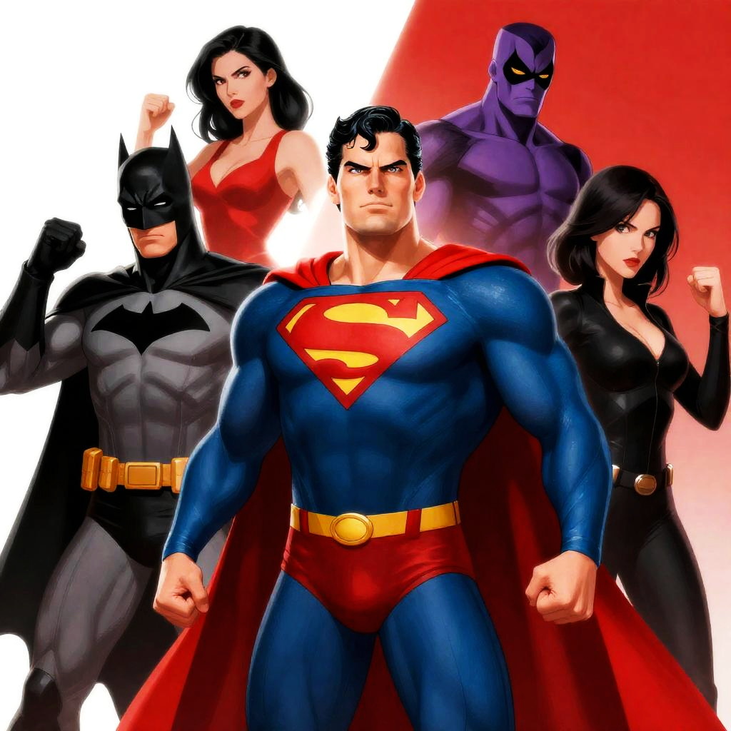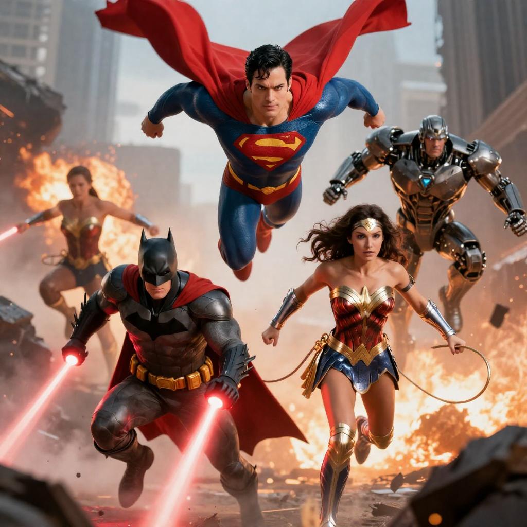Superhero team in dynamic battle pose. Superman flies forward, red cape billowing, eyes intense. Batman crouches, dual red beams, dark armor. Wonder Woman leaps, gold armor, lasso in hand. Cyborg, mechanical arm, determined expression. Background: fiery explosion, ruined cityscape. Bright colors, intense action, heroes in mid-air, glowing red beams. Five superheroes.