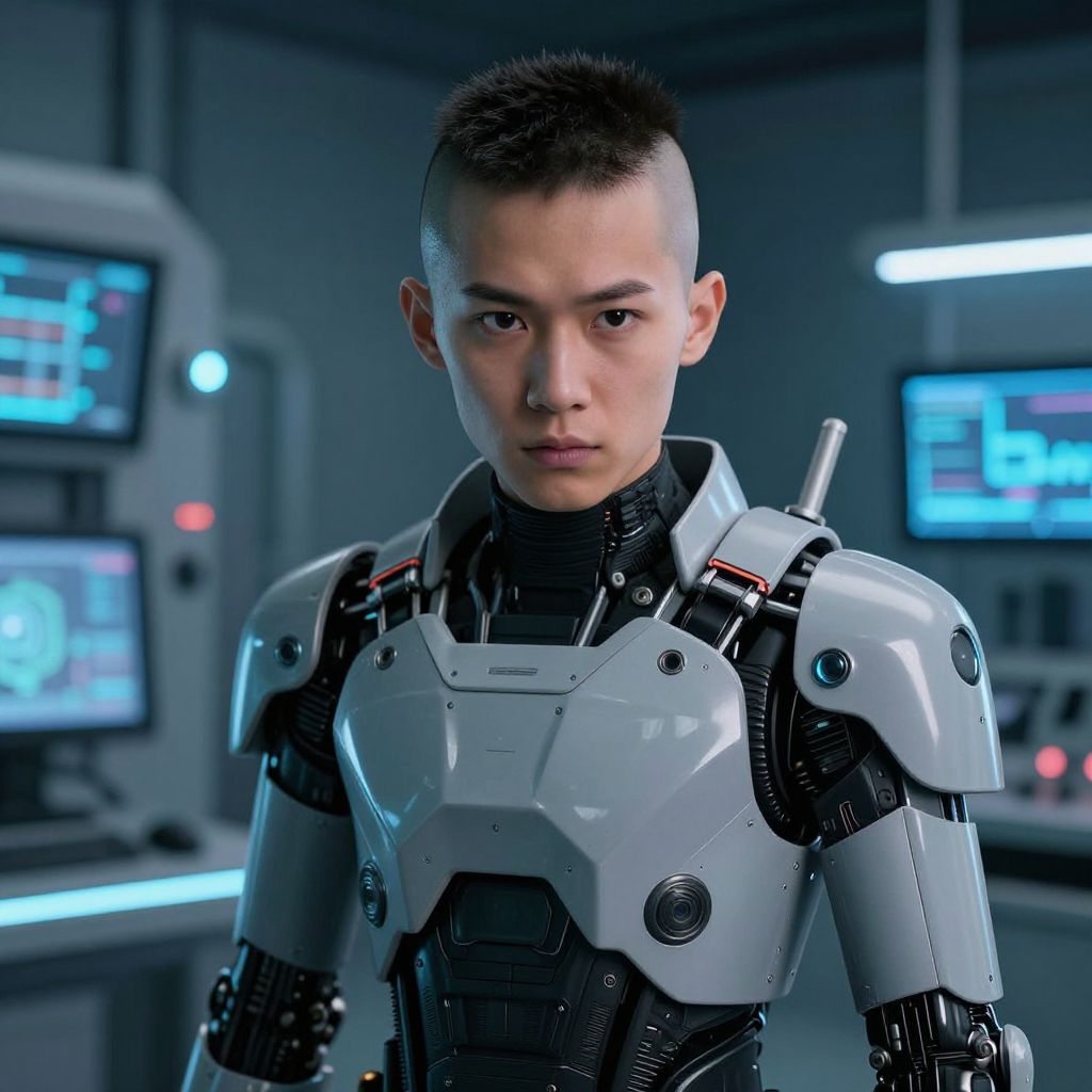 A young man with a shaved short hairstyle and a square face wears a futuristic robot costume in a technology lab filled with glowing screens and machinery, focused expression, cyberpunk lighting