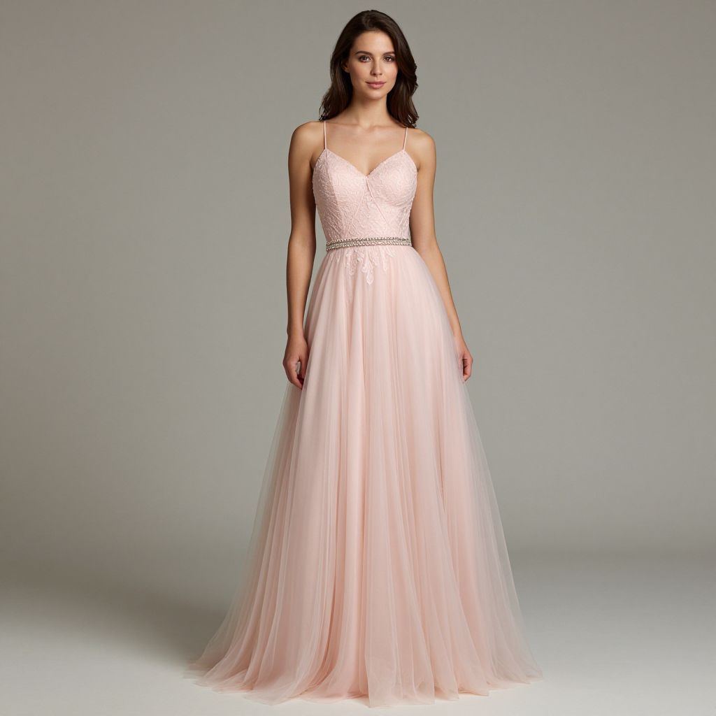 Elegant woman wearing a spaghetti strap pink lace-up prom dress featuring a beaded waistband and flowing tulle skirt, exuding sophistication against a neutral backdrop.