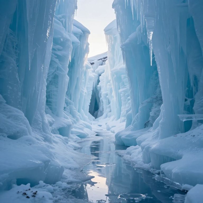 An ethereal journey through icy corridors of serenity and mystery, where the crisp air whispers of eternal silence and the melting ice reflects the transient beauty of hope.