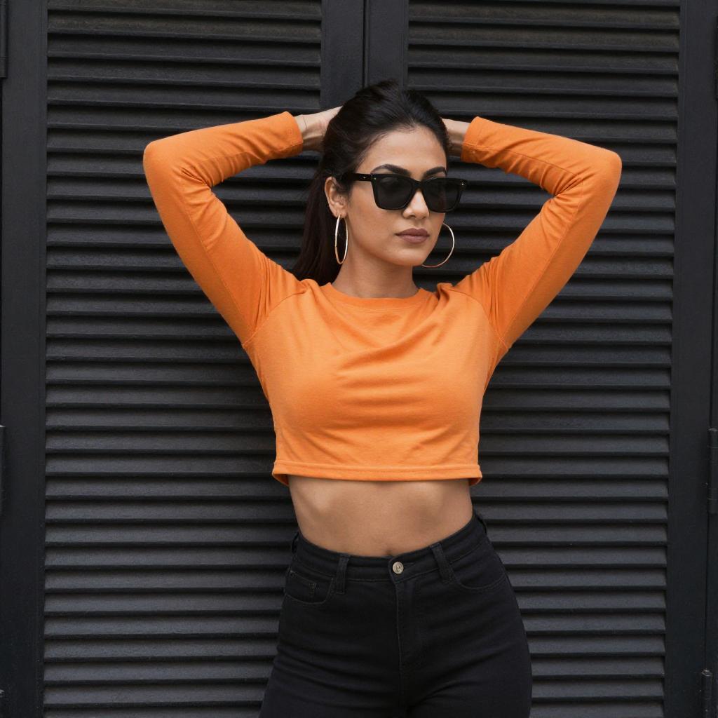 Photograph of a woman with dark hair in a ponytail, wearing black sunglasses, large hoop earrings, and an orange long-sleeve crop top that reveals her midriff. She stands with arms raised, hands behind her head, against a black louvered door. She wears black high-waisted pants.