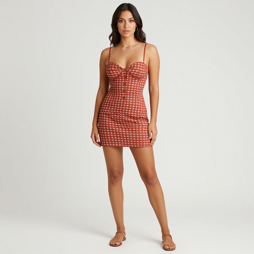 "Woman, contemporary casual, fitted mini dress in terracotta with a geometric grid pattern, sweetheart neckline, thin spaghetti straps, button-down front detail, short hemline, paired with brown strappy flat sandals, white backdrop in a photo studio setting.. Sexy. Pretty face and beаutiful eyes. Big breasts."