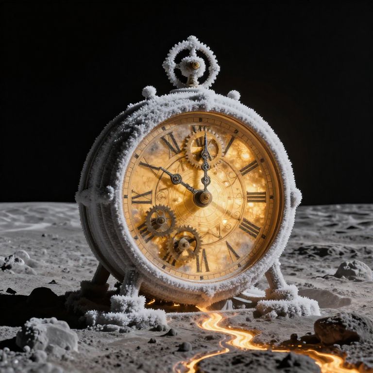 Eternal serenity collides with the weight of time as a celestial clock, cloaked in frost and bathed in golden light, defies gravity on a desolate lunar plain, its gears whispering secrets of existence while molten streams of memory carve paths into the timeless expanse.