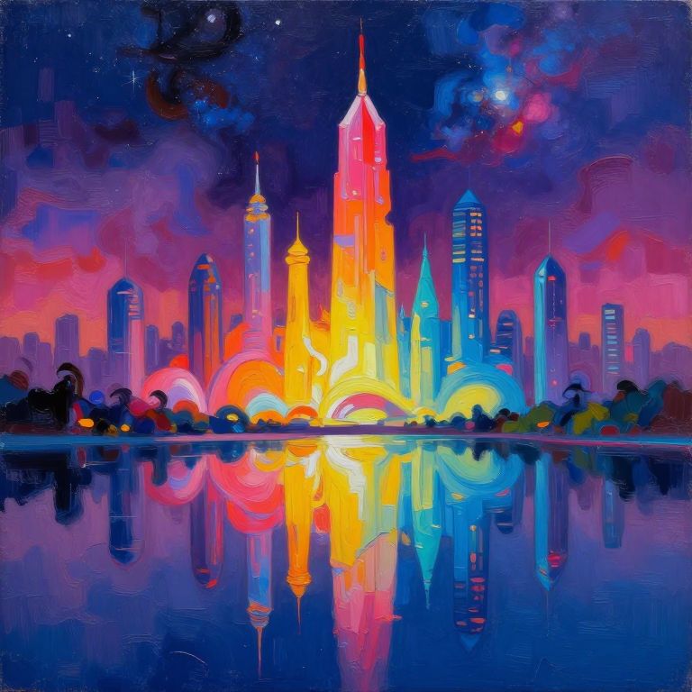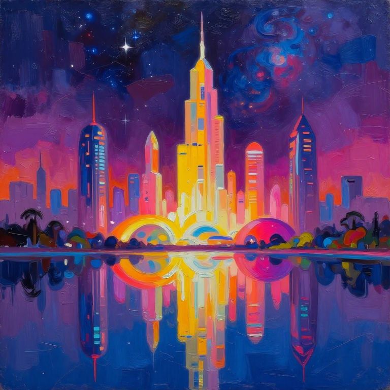 Abstract oil painting, gradient vibrant neon colour, rough, textural, broad brush strokes, a futuristic sci-fi city with tall towers skyscrapers, and domes, perfectly reflected in a tranquil, still lake, at night, surreal colours, detailed night sky with stars and nebulas