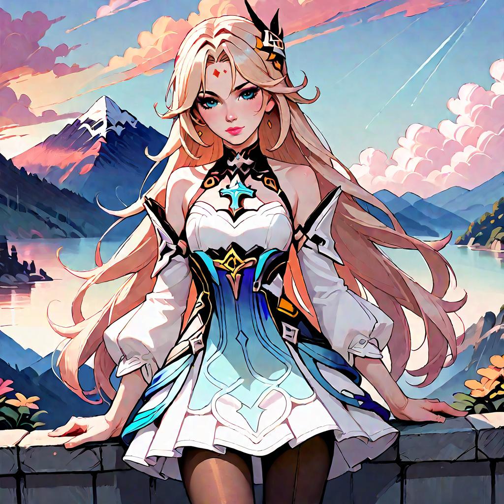 Score_9, score_8_up, score_7_up, score_6_up, score_5_up, score_4_up, source_anime, 1girl, fu xuan \(honkai: star rail\), hair ornament, long hair, dress, chest jewel, pantyhose, detached sleeves, forehead mark, choker, flat chest, cowboy shot, outdoors, solo, straight-on, looking at viewer, mountainous horizon, sunset