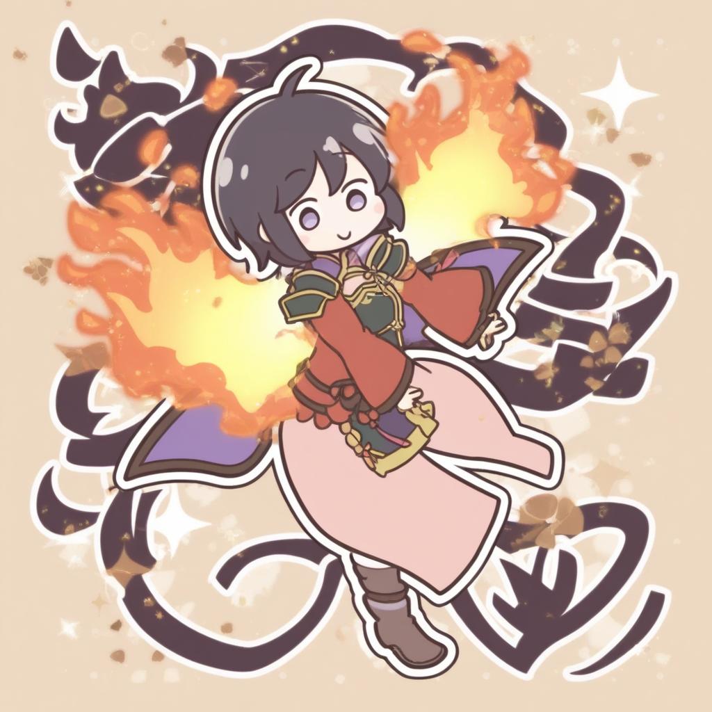 Chibi style digital illustration of Morgan, a female character from Fire Emblem, featuring short black hair with an ahoge, purple eyes, and traditional fantasy clothing. She is depicted with animated flames surrounding her, emphasizing her magic abilities. The artwork is inspired by artist kurororo rororo.