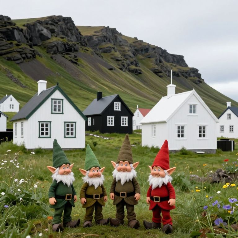 Deliberate small elf houses Iceland scenery, with elves in front of the houses, full body and face, hyper realistic photography,