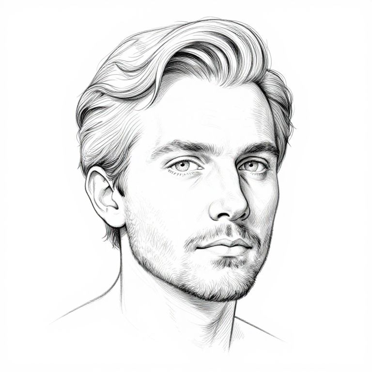 Black-and-white digital line drawing of a handsome man with wavy hair, light stubble, and intense gaze, facing forward.