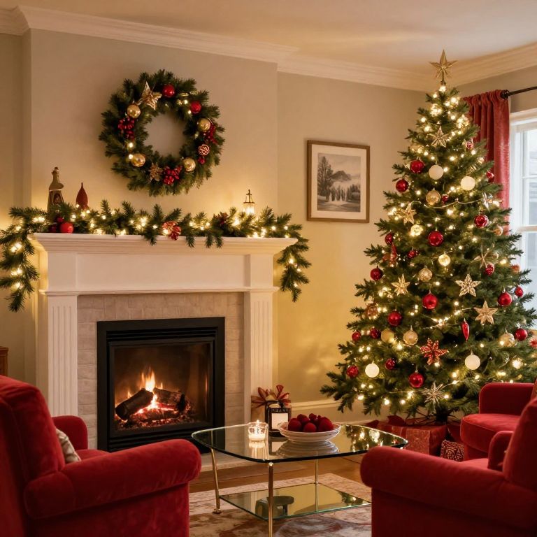 Cozy living room warmly decorated for Christmas, featuring a fireplace adorned with a festive wreath above, garlands draped along the mantel, and a lit tree to the right, complemented by red armchairs and a glass coffee table in front.