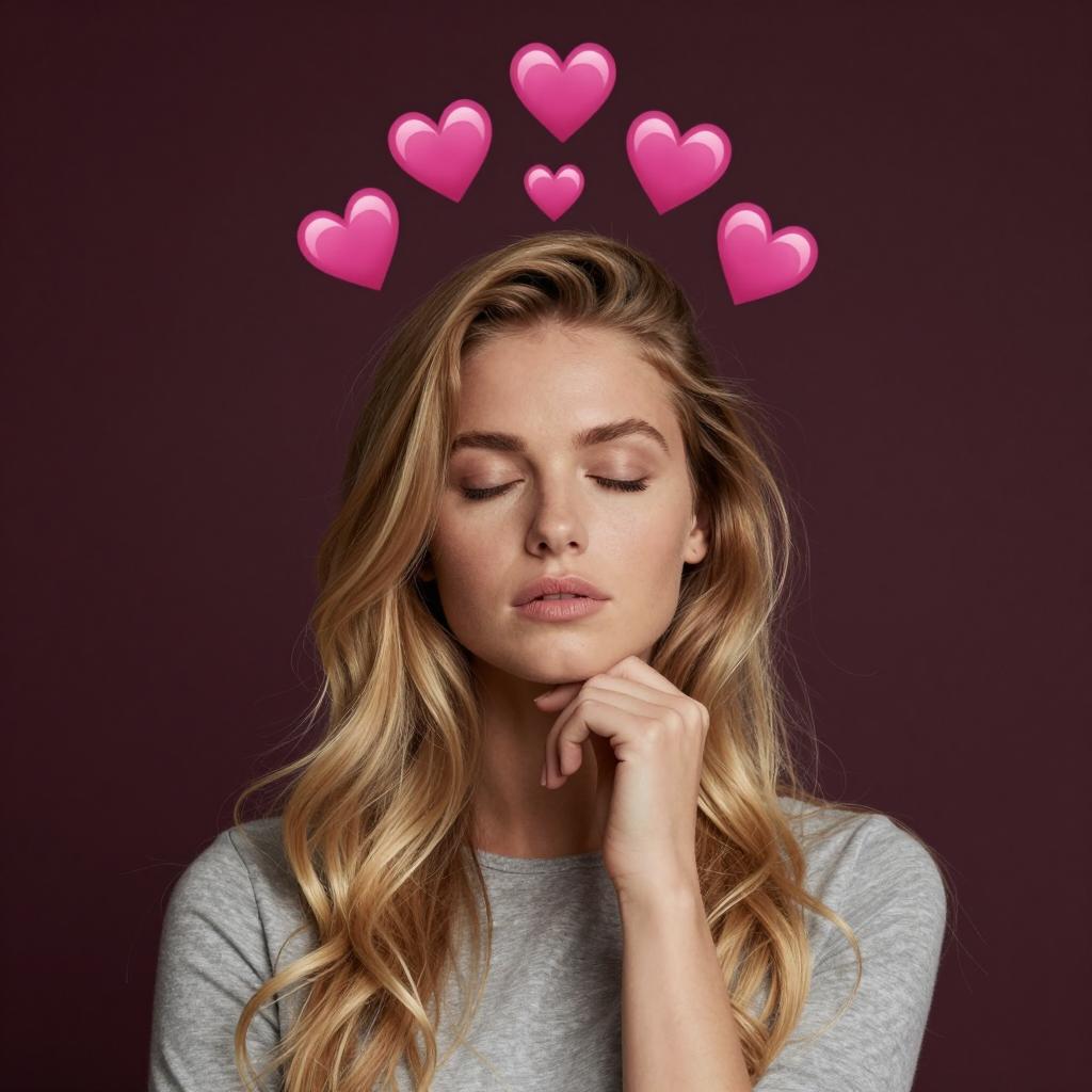 Photograph of a woman with long, wavy blonde hair, eyes closed, hand resting on her chin, wearing a grey top. Pink heart emojis float above her head. Dark, ured background. She has a pensive expression.