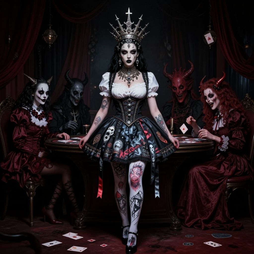 Ultra realistic portrait of Norwegian black metal horror satanic princess, 1girl, intricate:metallic:crown, hairband, big boobs, high heels, dirndl school uniform, pleated:skirt, stockings, graffiti art, inspired by Brad Kunkle, tutu, russ mills, p skirt ribbons, andrey, germany, mexico, bavaria, cuba, complex features, dark ambiente, circus setting, shiny, reflective, Jewlery, occult, warp, horror, lovecraft, demonic, devil, hell, hellish, poker, blackjack, casino, golden ratio, black metal album cover, trending on artstation, Art by Eiichir├Е┬Н Oda, (female clown:1.2), in the style of hasselblad 1600f, southern gothic