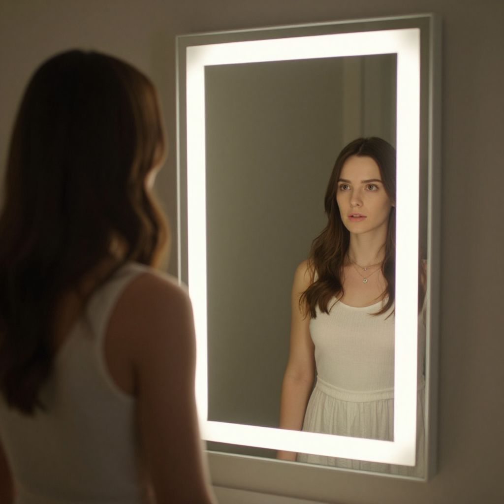 Photograph of a young woman with long brown hair, wearing a white sleeveless dress, standing in front of a brightly lit rectangular mirror, reflecting her