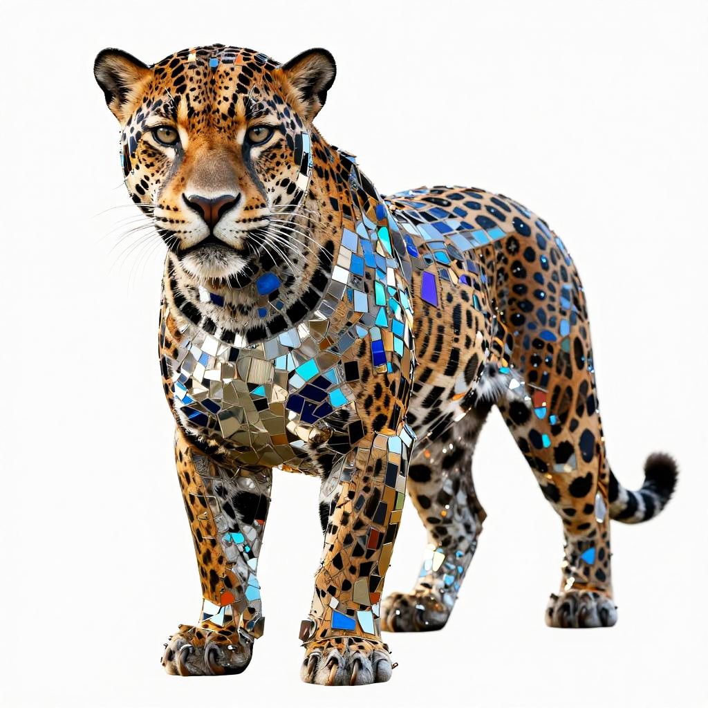 A detailed digital artwork featuring a graceful jaguar composed of a mosaic of small, colorful metal plates that form a fragmented, pixelated effect. The subject is portrayed in a surreal style, with carefully arranged blocks creating depth and definition. The color palette is vibrant, including shades of black, silver, neon blue, chrome that reflect light, giving the artwork a luminous quality.