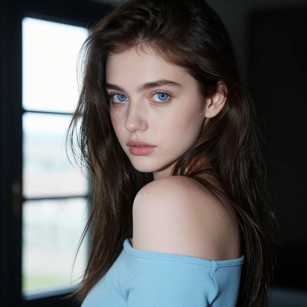 Photograph of a young woman with fair skin and striking blue eyes. She has long, dark brown hair that's slightly messy, and she's wearing an off-the-shoulder, light blue top. She's looking over her shoulder with a subtle, neutral expression. The background is dark with a window showing a bright, blurred outdoor scene. The lighting highlights her face, creating a soft glow.