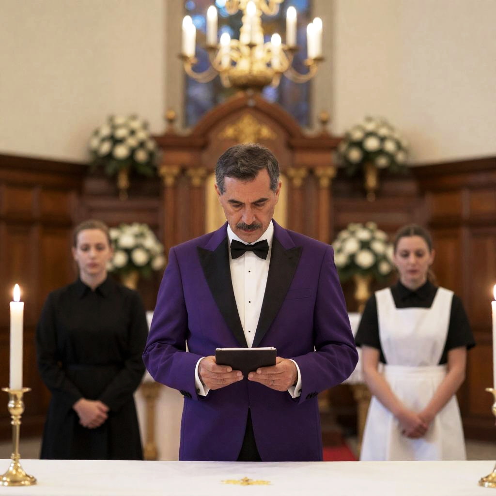 Middle-aged man with mustache in purple tuxedo, white shirt, black bow tie, stands at altar, reading. Two maids in black and white uniforms stand in background. Ornate church interior, chandelier, floral arrangements. Candlelit, wood paneling.