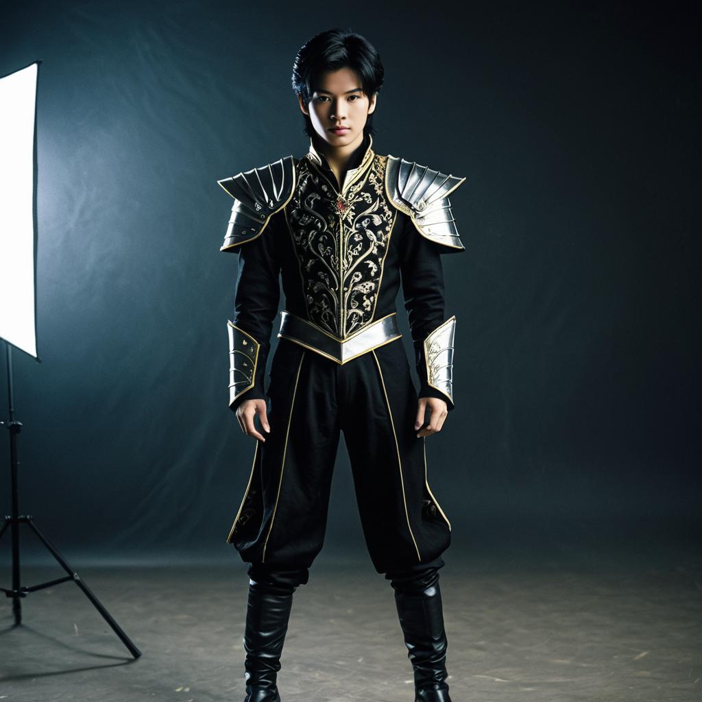 A young Asian man with black hair dressed in a detailed black and gold fantasy prince outfit. The costume features ornate embroidery, metallic shoulder armor, and matching gauntlets. He stands confidently against a dark studio background, illuminated by a softbox light on the left side.