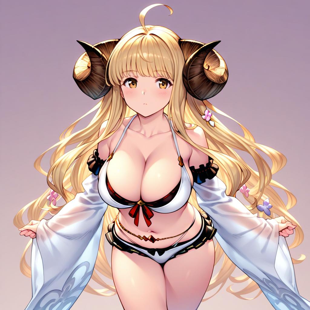 Anila (summer) (granblue fantasy), granblue fantasy, 1girl, sheep horns, curled horns, yellow eyes, short eyebrows, thick eyebrows, blonde hair, very long hair, ahoge, blunt bangs, large breasts, cleavage, thighs, navel, collarbone, white bikini, layered bikini, detached sleeves, bare shoulders, wide sleeves, draph, belly chain, by artist bubuzuke, illustrious