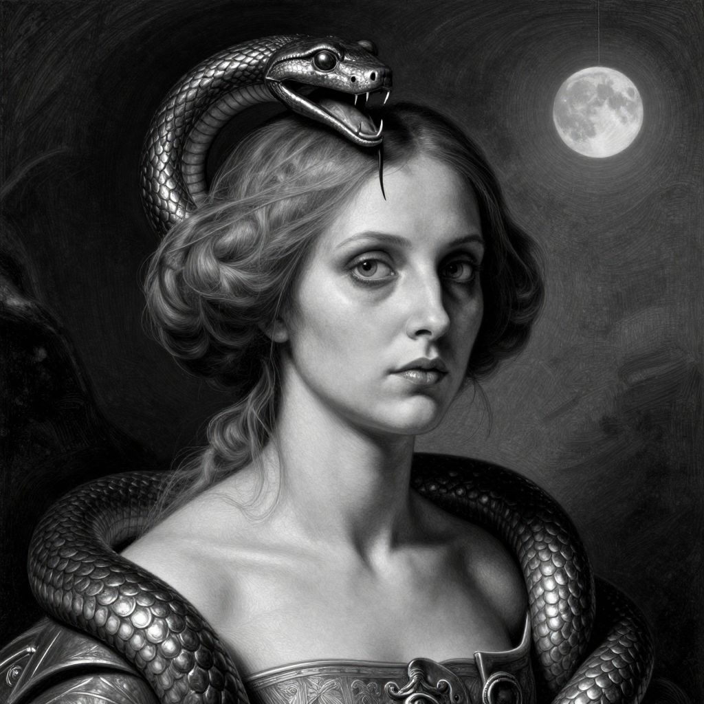 Granulation Mutant woman with wide head , Chiaroscuro, style of Giuseppe Gradella, Serpent:: horror::1 metallic::1 renaissance::1 moonlight::1 super resolution microscopy::1,