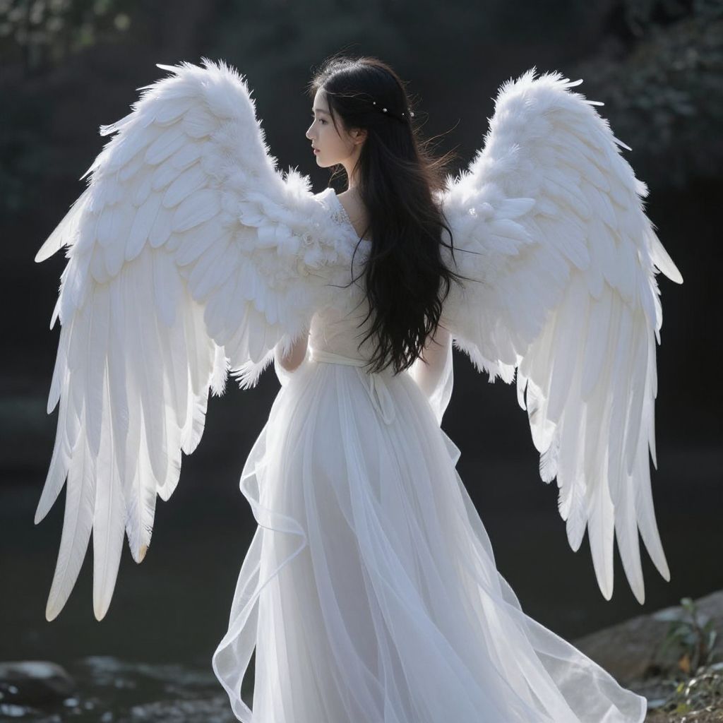 A serene Asian woman wearing a flowing white gown, adorned with large, detailed white feathered angel wings. She stands outdoors with soft natural lighting highlighting the delicate texture of her wings and dress. Her long black hair cascades down her back, complemented by subtle hair accessories. The image evokes a celestial, ethereal atmosphere.