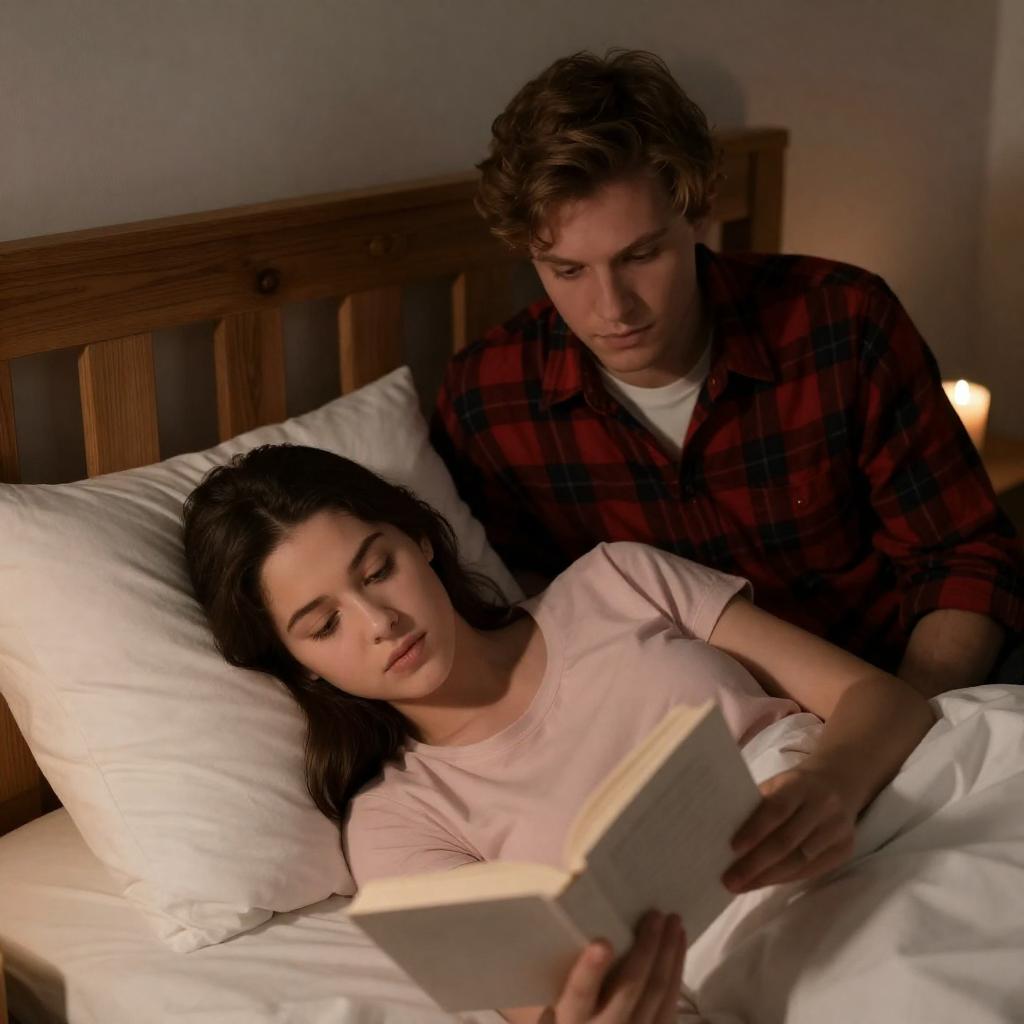 Photograph of two people in a dimly lit, wooden bed. Young woman with dark hair, white pillow, and pink shirt lies down, reading a book. Man with light brown hair, red plaid shirt, and white collar sits behind her, watching intently. Soft light from left side, candle on right.