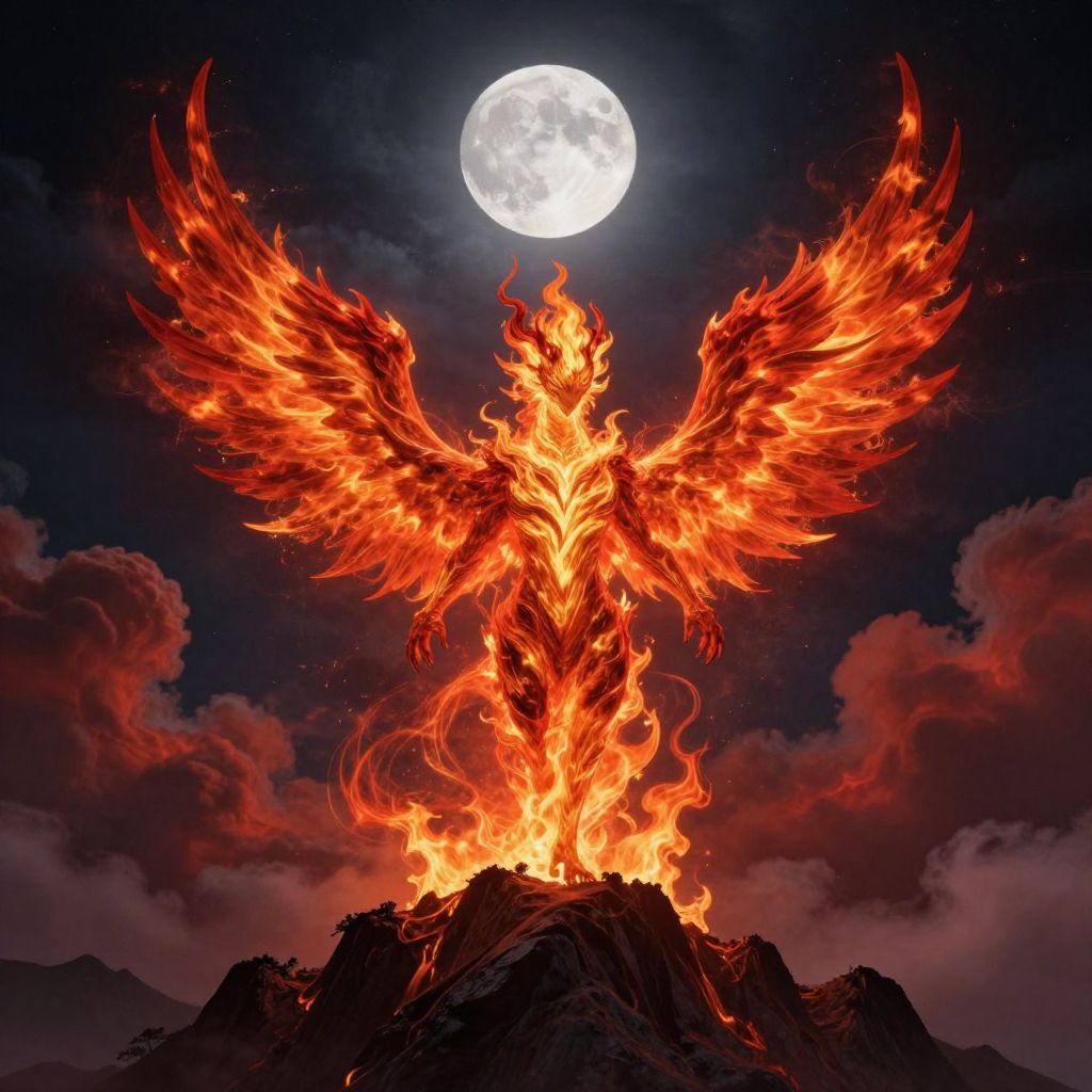 Infrit depicted as a majestic fire spirit rising above a mountain peak, flames forming elegant wings and a blazing tail, vibrant reds and oranges mixing with dark smoky hues, dramatic clouds parting to reveal a glowing full moon in the night sky.