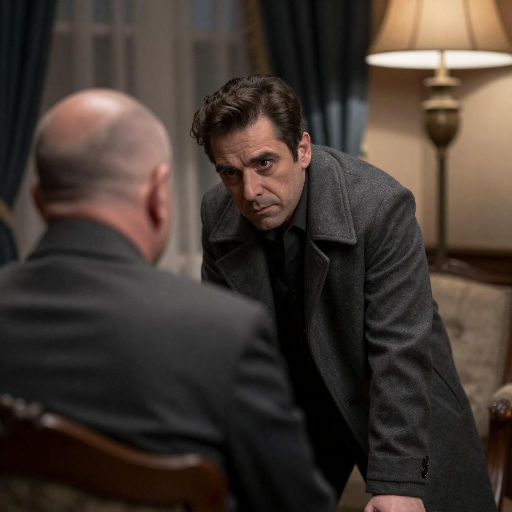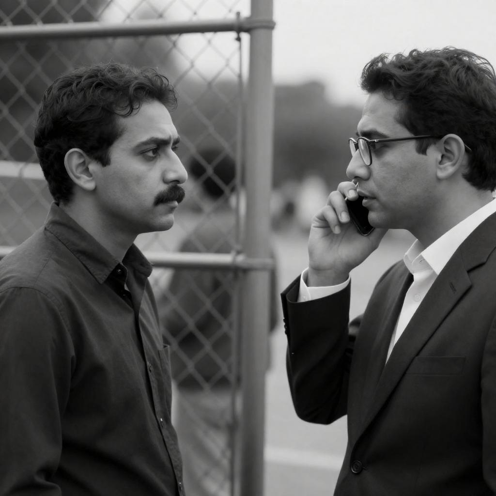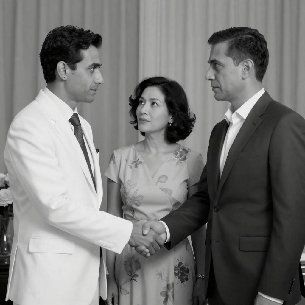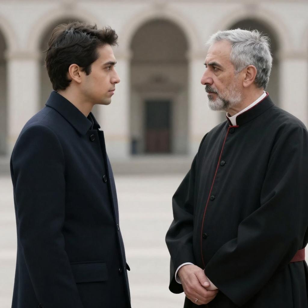 Photograph of two men in white robes with dark hair, engaged in a heated conversation at a dark wooden table with a decorative teapot. The background features ornate, gold-accented furniture. The man on the left gestures with his right hand, while the man on the right leans forward, his left hand on the table.