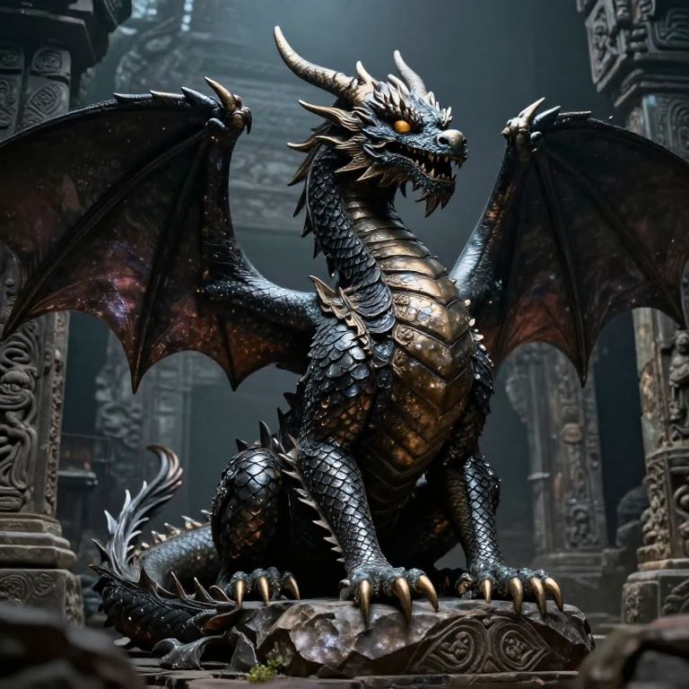 Photograph of a detailed, black-scaled, metallic-looking dragon figurine with wings and horns, poised over a chessboard in a dimly lit room. The dragon is mid-leap with claws extended, its scales reflecting the warm glow of a single, lit candle to the left. The chessboard features alternating black and white pieces, with the dragon's presence seeming to dominate the game. The background is dark and blurred, focusing attention on the illuminated dragon and chessboard. The candlelight casts dramatic shadows, enhancing the dragon's textured scales and the chess pieces' intricate designs.