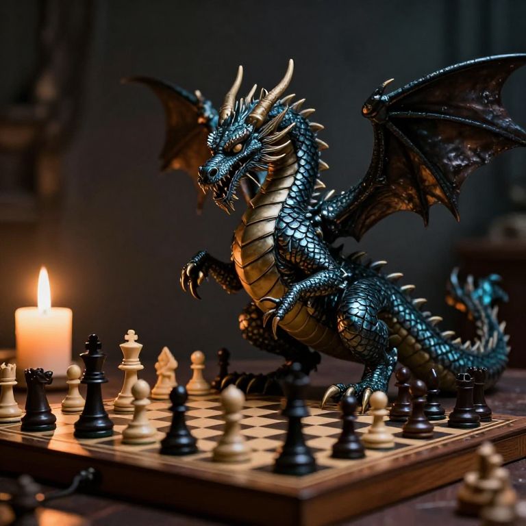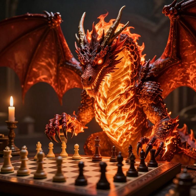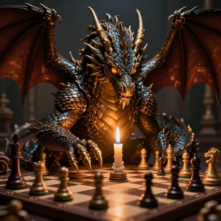 In the flickering glow of a candle, a majestic dragon contemplates the dance of strategy on a chessboard, embodying the eternal struggle between power and intellect, while the warmth of the flame contrasts with the cold, calculated precision of its scales.