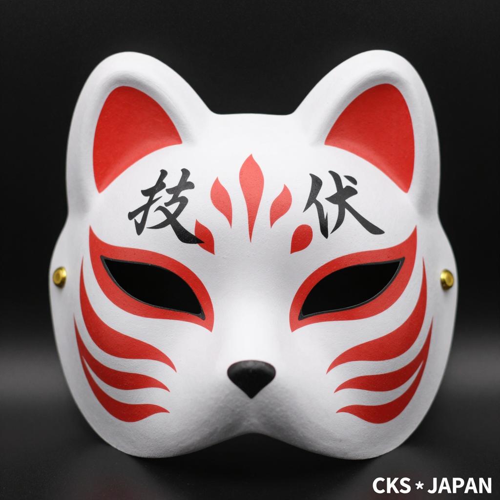 White fox mask with red markings, large pointed ears, and black eye slits. Red cord with gold rings on sides. Black background. Smooth, glossy ure. Symmetrical design. Flat, front-facing position.