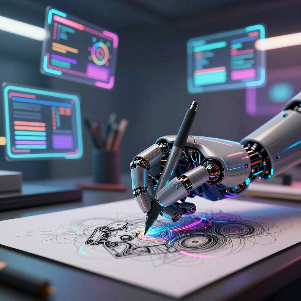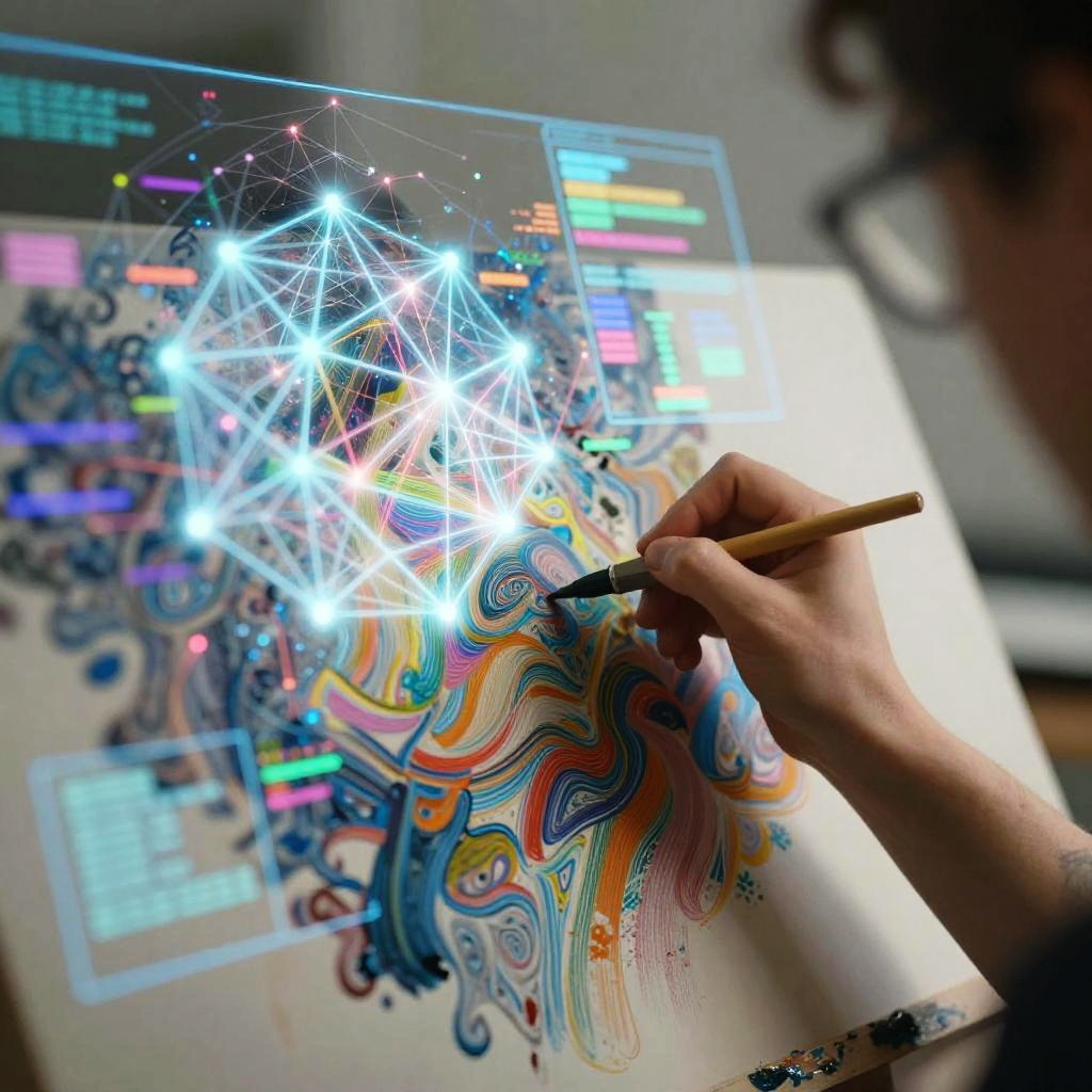 Art to AI integration scene with an artist merging brush strokes with digital geometric patterns of AI data, glowing interfaces blending organically with natural textures, background filled with abstract neural network visualizations and colorful glitch effects, hyperrealistic and futuristic atmosphere.