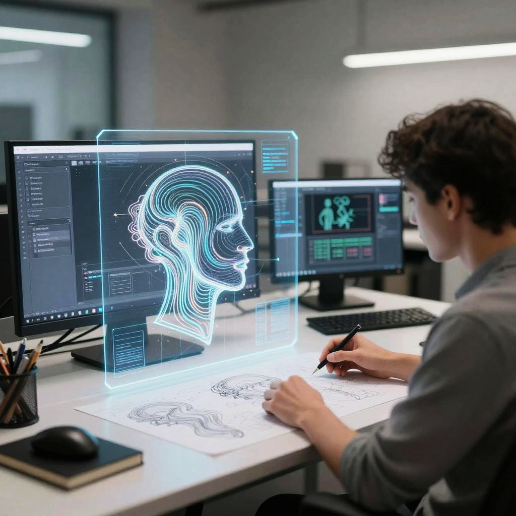 Photograph of a person's hand using a wooden pen to draw on a white sheet of paper, covered with a vibrant, abstract, multi-colored ink design. The hand is in the right foreground, while the detailed drawing features swirling patterns in blue, orange, and red. In the background, a semi-transparent digital interface with bright, glowing blue star-like icons overlays the paper, adding a futuristic touch. The interface has colorful rectangular bars and text, slightly blurred. The person's face is out of frame, and the setting appears to be a studio or workspace with soft, diffused lighting.