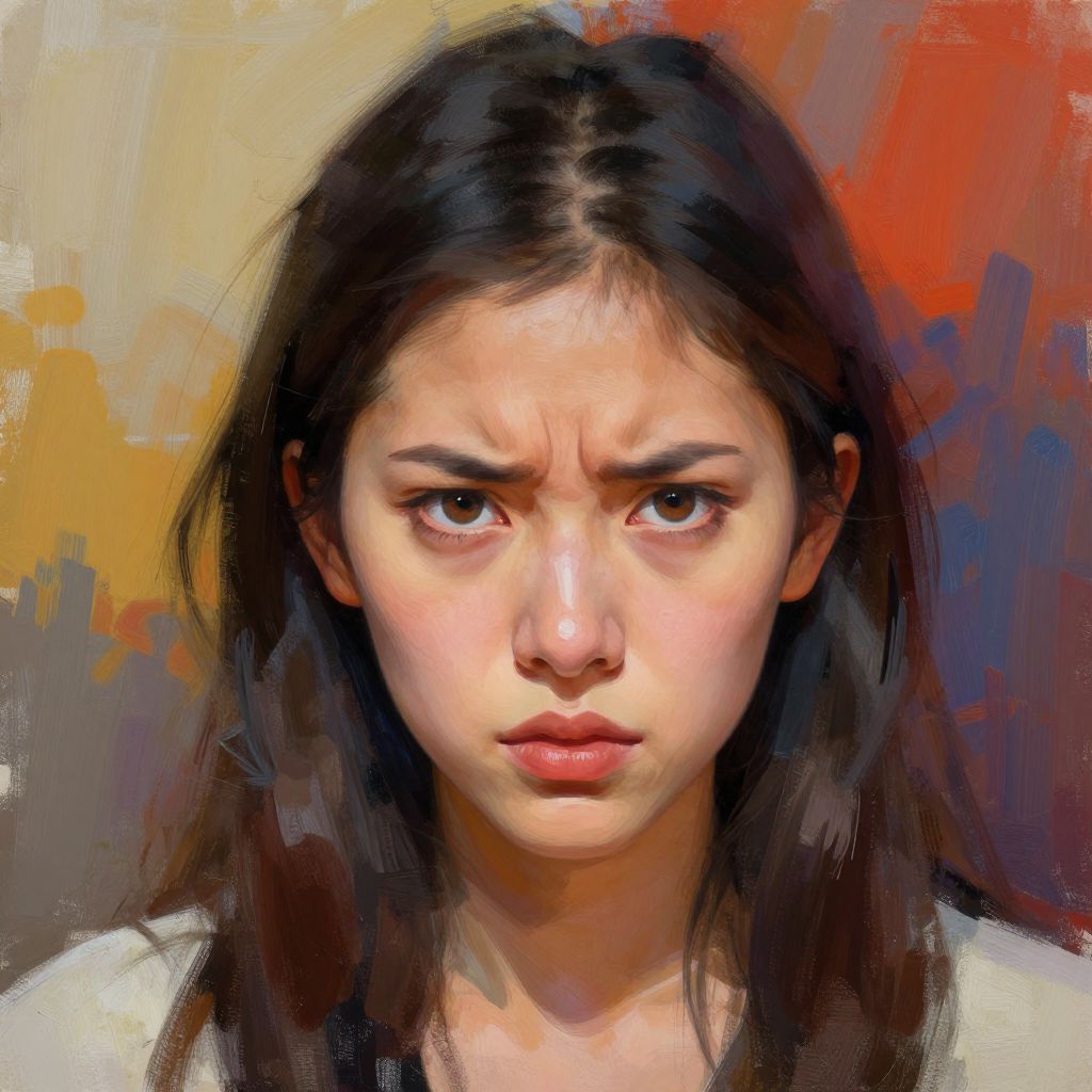 Angey expression on a young woman’s face in a digital painting, intense glare with furrowed brows, vibrant contrasting colors in abstract background, emotional depth, close-up portrait with sharp brush strokes and textured skin details