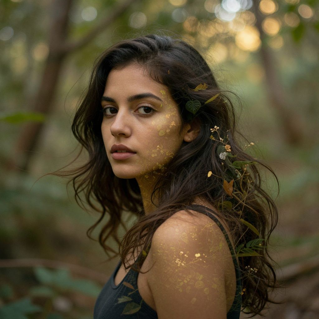A captivating double exposure portrait showcases a young woman with cascading dark hair in the wind. Her features are partially concealed by an intricate overlay of lush foliage - leaves, flowers, and branches entwined around her face. This natural imagery seamlessly merges with her skin tones, establishing harmony between nature's embrace and human essence. As she strides through a verdant forest, her determined gaze hints at an impending significant discovery or transformative moment. Warm golden light filters through the canopy above, casting soft shadows that accentuate both her facial textures and the enveloping natural elements. This portrait evokes a sense of adventure and introspection as it blurs the lines between subject and environment, prompting viewers to contemplate their own bond with nature and journey of self-discovery.